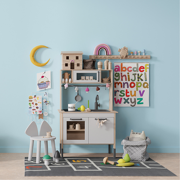 Chez nous, ils ne sont jamais très loin : une cuisine miniature, un établi en bois, une petite coiffeuse d’enfant, une marchande installée dans un coin du salon…
