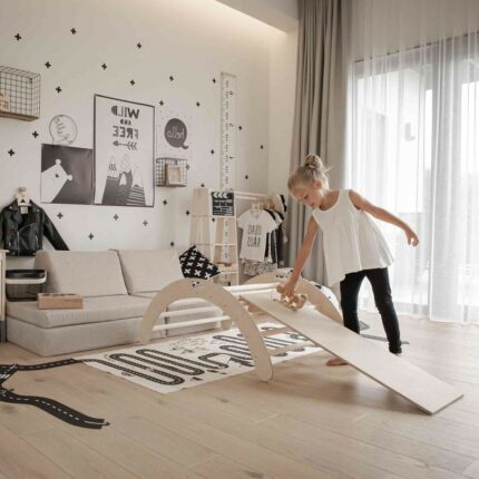 Design minimaliste et évolutif : Polyvalente (escalade, bascule, équilibre), elle s’adapte aux besoins croissants de l’enfant, devenant tunnel, portique ou table basse en un geste.