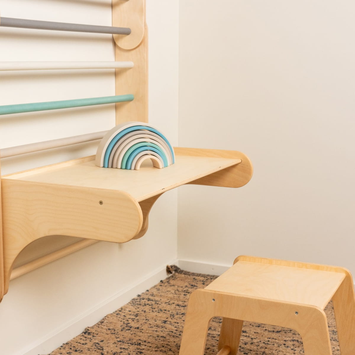 Le plateau de bureau réglable en hauteur est le cœur de ce système évolutif. Choisissez l’échelon adapté sur le mur suédois : bas pour les bébés qui apprennent à se tenir debout en s’agrippant aux barres en bois solides, ou plus haut au fur et à mesure que votre enfant grandit. Le plateau reste parfaitement stable une fois fixé, tandis que la chaise légère et maniable se déplace facilement par les petites mains, favorisant l’autonomie dès le plus jeune âge. Associez-le au triangle grimpeur Pikler pour une transformation magique en mur d’escalade complet à double face. Les enfants adorent grimper, explorer et se challenger, développant ainsi leur dextérité, leur coordination et leur équilibre de manière naturelle et amusante.