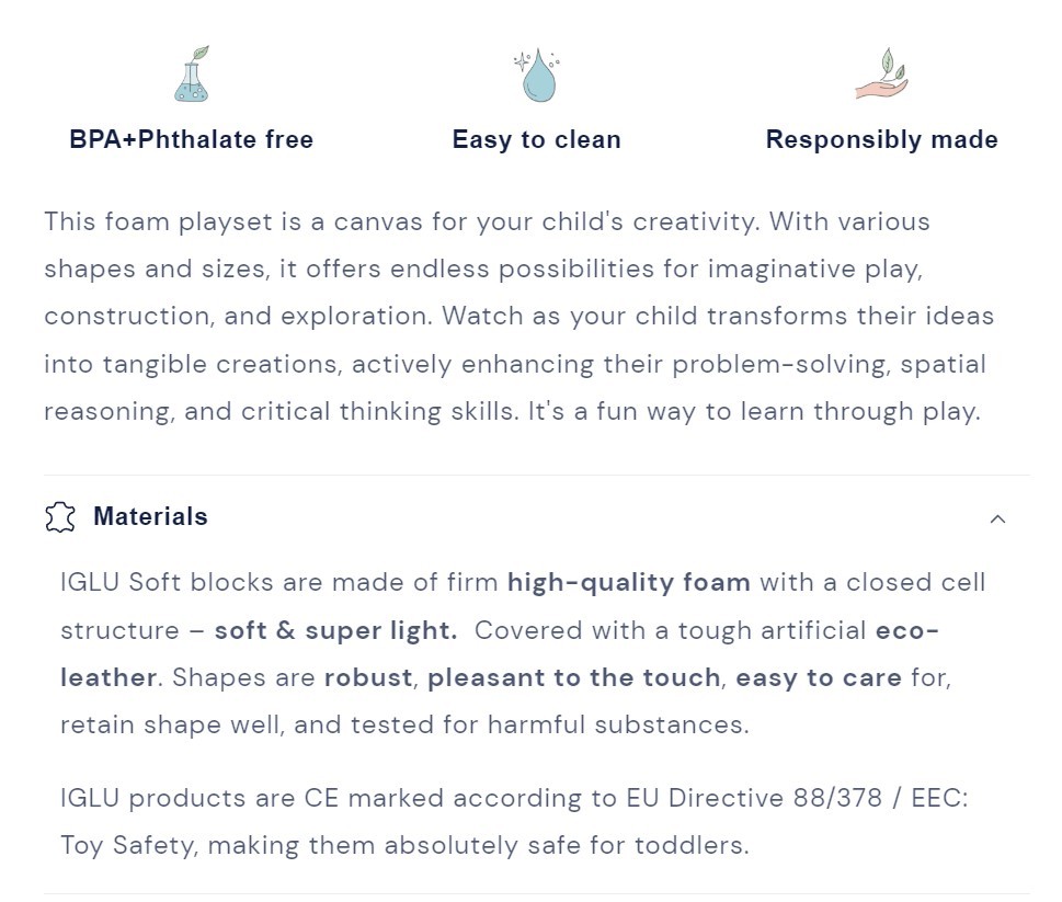 Ce coffret comprend dix formes variées fabriquées en mousse haute densité, légère mais robuste, recouvertes d’un textile écologique doux au toucher. Chaque bloc est conçu pour garder sa forme, permettant une manipulation aisée par les petites mains et garantissant la sécurité grâce à ses bords arrondis.