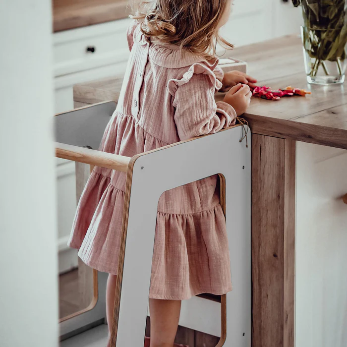 Votre enfant accède facilement au plan de travail, à l’évier ou à la table, favorisant son indépendance tout en rendant les tâches quotidiennes ludiques. -